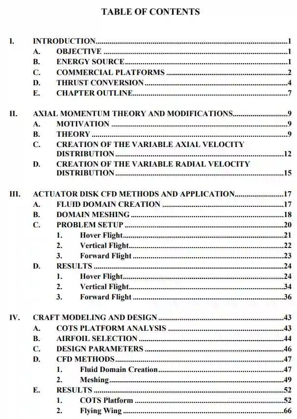本论文利用轴向动量理论(AMT)的修改版本和计算流体动力学(CFD)来模拟具有类似的简化流动的多个螺旋桨,以估计商业现货(COTS)垂直起飞和降落(VTOL)平台上的空气动力和重力作用。利用AMT的修改版本,对COTS平台和为前向飞行优化的新设计进行了比较,以研究VTOL飞行器的潜在改进。