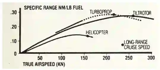 "飞机的航程取决于诸如空速、燃料容量、载荷、悬停要求和起飞/降落配置等因素" [13]。传统的飞机在起飞时的推力值是被提升的总重量的百分之三十到四十[11]。对于VTOL飞机,垂直升降模式下的推重比必须超过工作重量一定的幅度[14]。图4显示了V-22飞行包络线与传统飞机相比的优势。