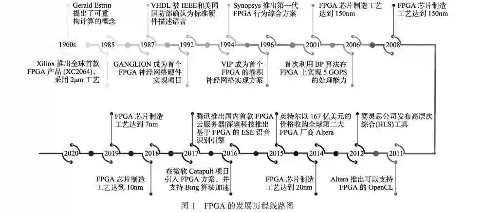 FPGA(Field Programmable Gate Array)是现场 可编程门阵列,它允许无限次的编程,并利用小型 查找表来实现组合逻辑. FPGA 可以定制化硬件流 水线,可以同时处理多个应用或在不同时刻处理不 同应用,具有可编程、高性能、低能耗、高稳定、 可并行和安全性的特点,在通信、航空航天、汽车 电子、工业控制、测试测量等领域取得了很大应用 市场. 人工智能产品中往往是针对一些特定应用场 景而定制的,定制化芯片的适用性明显比通用芯片 的适用性高. FPGA 成本低并且具有较强的可重构 性,可进行无限编程. 因此,在芯片需求量不大或 者算法不稳定的时候,往往使用 FPGA 去实现半定 制的人工智能芯片,这样可以大大降低从算法到芯 片电路的成本. 随着人工智能技术的发展,FPGA 在加速数据处理、神经网络推理、并行计算等方面 表现突出,并在人脸识别、自然语言处理、网络安 全等领域取得了很好的应用.