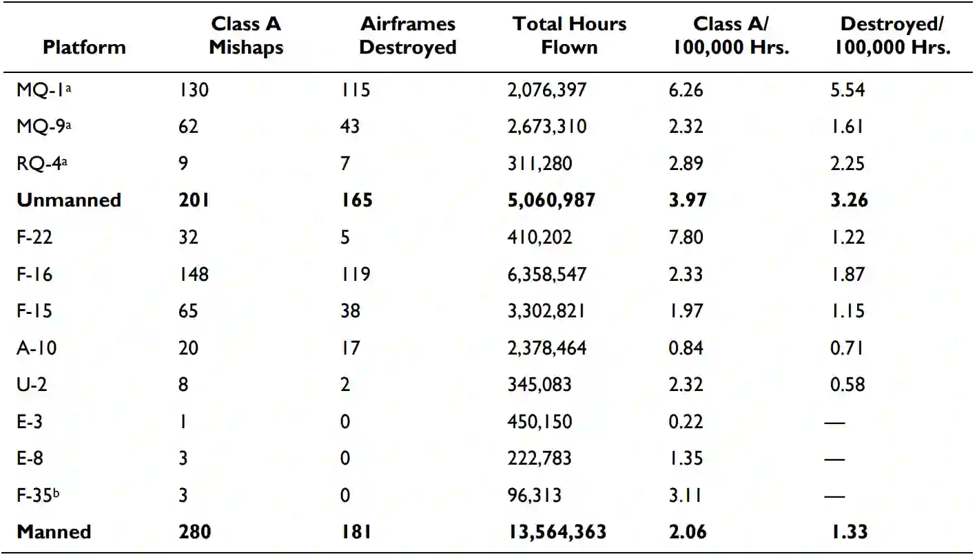 此外,无人机系统的采购和操作可能比有人驾驶的飞机更便宜。然而,较低的采购成本可能会与国防部的意见相权衡,即无人驾驶平台比有人驾驶平台更有可能发生A类事故,即造成250万美元的损失、生命损失或飞机毁坏的事故(表1)。当比较事故率时,即以每10万小时飞行的事故报告,以便对不同类型的飞机进行比较,与有人驾驶的飞机相比,无人驾驶的飞机发生A级事故的可能性要高92%;当MQ-1的事故率从无人驾驶的子类别中删除时,与有人驾驶的飞机相比,MQ-9和RQ-4发生A级事故的可能性高15%(见表1)。虽然与无人驾驶平台相比,有人驾驶飞机通常有更多的A类事故,但这一结果可能是由于有人驾驶飞机的数量更多。