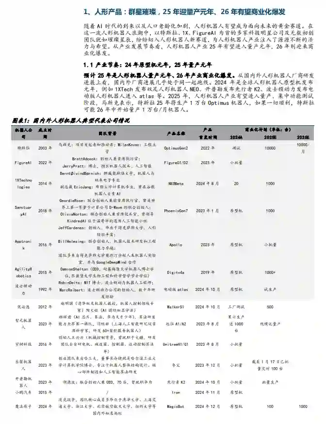 量产新纪元+DeepSeek 成功, 人形机器人从理想走进现实 在科技浪潮的推动下, 人形机器人成为未来最为确定的方向之一,获得了国内外顶级政策、 政企资金以及科技龙头的全方位加持,产业进入快速发展期。预计 25 年人形机器人产业可总结为 2 大关键词:(1)量产。过去 2 年,国内外众多科技及初创企业如璀璨星辰,纷纷切入人形机器人新赛道, 2024 年是国内外人形机器人的原型机发布大年, 如1XTech 的 NEO、开普勒的先行者 K2、小鹏的 Iron,经过半年到一年的技术优化与调试, 2025 年有望成为真正的量产元年。国际巨头特斯拉一马当先,预计 25 年生产 1 万台 Optimus, 26 年年中开始量产 1 万台/月, 27 年达 50 万台。2 月 6 日,特斯拉发布招聘机器人生产制造工程师,再次强化其机器人量产进程。1 月 30 日, figureAI 公司中标第二个大客户、并表示未来 4 年将量产 10 万台人形机器人。国际巨头人形机器人的量产是产业从概念到应用现实的重大跨越,对发掘人形机器人通用应用场景具备战略指导意义,产业进入“chatGPT”时刻前夕。(2) DeepSeek。DeepSeekAI成功突破 AI 发展的高昂成本问题, 凭借降本、开源的优势, 在人形机器人领域展现出强大的赋能能力, 有望助力机器人在环境感知、任务规划与决策、持续进化等大模型方面实现质的飞跃。此外, DeepSeek 也让国产厂商在 AI 领域看到希望,强化国产机器人在软件端持续深耕和突破的信心。 聚焦商业化量产短板及产业分工细化趋势,建议关注丝杠和运控及国产机器人链总成环节 (1)硬件端,丝杠产能紧缺是量产痛点。从量产维度看、产能是关键。近两年国内外机器人厂商的硬件设计方案百家争鸣,总体路线目前已趋于收敛。人形机器人硬件不再是本质约束条件,难点主要体现在规模制造及降本能力上。其中,丝杠制造难度相对最高、产能也最为紧缺,属于重资产、劳动密集型环节,短期快速扩产难度大。国内目前已建成的丝杠产能不足以满足人形机器人的量产需求。而恒立液压线性驱动器项目在产能建设上处于全球领先水平, 项目总投资 15.27 亿元, 设计产能 20 亿元, 目前公司线性驱动器项目已投产、 滚珠丝杠产品已进行送样和小批量供货。随着下游人形机器人量产的临近,我们看好恒立液压在丝杠及线性总成的产能优势及快速放量能力。 (2)软件端, “小脑”智能亟待突破,运控是被忽视的短板。机器人从软件算法策略上分为“大脑”和“小脑”,“大脑”负责感知外界并模拟人类思维决策过程,“小脑”则模仿生物进行复杂的运动,即运动控制。受益于 AI 大模型的发展,机器人大脑智能化程度有望提升、 已备初阶人类脑力。而“小脑”是由一系列算法和硬件设备组成的综合系统,包括传感器融合模块、动力学模型和控制器等, 控制人形机器人全身上下几十个自由度进行高维运动,受制于没有通用的算法模型以及海量数据,是当前产业发展的瓶颈。如何进一步提高机器人小脑运动控制算法的实时性、鲁棒性和可解释性是下一步产业重要研究方向。建议关注人形机器人小脑智能运控赛道的进步和突破。 (3) 产业链分工有望细化、看好国产机器人链本体代工或总成商。随着产业生态的发展,产业链有望从垂直走向细分, 形成专注机器人软件或专注机器人硬件的产业分工。24 年 11 月, 华为与禾川科技、兆威机电等 16 家公司签订战略合作协议,就具身智能领域展开合作、 共同搭建生态圈。我们认为,像华为这样具备具身大模型研发能力的公司积极布局相关根技术与产业创新赋能, 有望给国产机器人本体厂商带来 AI 能力,助力国产机器人厂商可专注于本体或应用场景开发, 实现弯道超车。因此建议关注掌握核心零部件自制能力并具备机器人总成能力的公司。