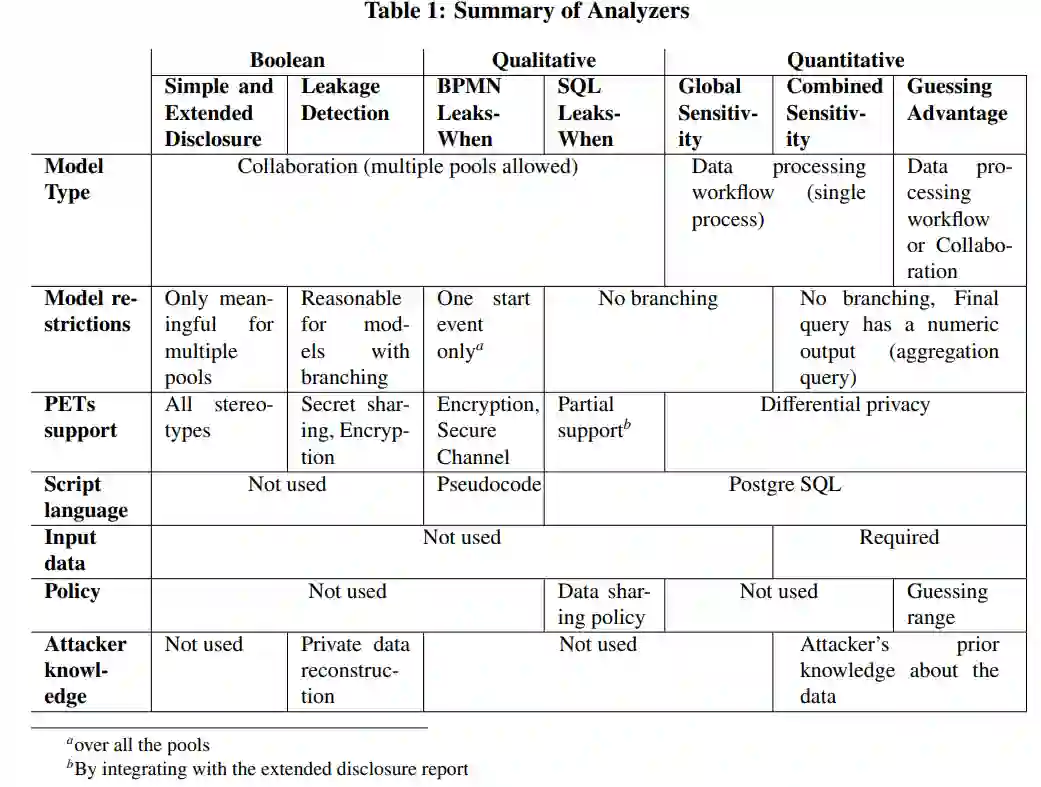 本文提出了大量用于描述业务流程隐私属性的建模和分析工具。建模注释和分析以业务流程建模符号(BPMN)为基础,分为三大抽象层级。第一个层次允许查看哪些输入数据源直接或间接地披露给流程中的每一方。第二层显示了每次披露发生的条件,以及披露的具体属性。第三层可以衡量披露在多大程度上揭示了单个项目的信息。大多数分析都集成到 Pleak 工具中,从而提供了一个统一的界面。