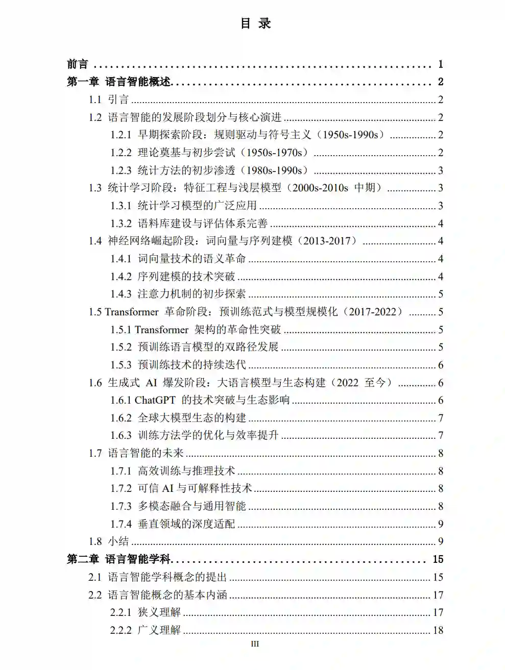 在人工智能与数字文明深度交融的时代背景下,语言智能作为人机协同的核 心驱动力,正以前所未有的速度重塑教育体系、跨文化交流、产业创新与社会治 理模式。为系统梳理该领域的技术演进、学科构建与应用生态,本白皮书汇聚产 学研多方智慧,围绕“技术-学科-应用”三维体系展开深度探索,深度解构其技 术攻坚路径、生态构建逻辑与治理挑战,旨在为技术探索者、政策设计者及产业 实践者提供前沿洞察与决策参考。 白皮书首先纵览语言智能发展轨迹,揭示其从规则驱动、统计学习到深度学 习的范式跃迁规律,勾勒出技术从感知理解向认知推理跃升的进化路线;进而奠 定学科根基,通过界定理论边界与时代必要性,构建“核心框架-技术体系-学科 关系”三维模型,并探索外语学科智能化转型的实践路径;最终聚焦技术内核, 围绕语言理解(机器的“读心术”)、语言生成(“创作力觉醒”)与语言交互 (人机“灵魂对话”)三大核心能力,将可信安全深度嵌入技术基因,确立“能 力越强,防护越密”的同步进化准则。 白皮书聚焦四大关键应用场景:教育智能通过作文批改的“篇章要素抽取→ 跨提示评分→可解释反馈”全链优化,及儿童语言评价的多维度框架,实现从结 果判定到过程干预的跃升;跨语言服务针对东南亚低资源语言(如老挝语),突 破语料与文化瓶颈,构建“神经机器翻译→知识增强→大模型优化”技术梯队; 社会治理依托负面情感分析攻克反讽识别与隐式情绪挖掘,筑牢公共安全与金融 风控决策基座;多模态关联以多模态知识图谱为枢纽驱动跨模态语义对齐及多跳 推理,助推工业质检、医疗诊断等场景智能升级。 白皮书通过“总结与展望”章节,勾勒出技术融合推动语言生成与大模型推 理协同进化,增强低资源场景适应性;学科建设深化外语教育与 AI 的嫁接,培 育跨领域人才;可信机制构建覆盖模态均衡性与文化偏见监测的动态防护体系; 最终以人本愿景实现“任意模态输入,统一语义理解”的可靠认知底座,驱动语 言智能服务人类文明包容性发展。 我们期望白皮书能够为语言智能领域的可持续发展提供策略建议,促进技术 创新,推动产业升级,为政策制定者提供学科建设与伦理治理参考,为技术开发 者厘清攻坚方向,为产业界锚定商业化路径,助力中国在全球语言智能浪潮中占 据创新制高点,并为构建智能社会贡献智慧和力量。