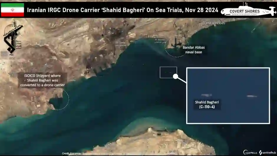 伊朗伊斯兰革命卫队(IRGC)最新宏大的海军项目——无人机航母 Shahid Bagheri(C-110-4)已经启航。该舰似乎正在进行海试,现在可能停泊在阿巴斯港外。这艘由商船改装而成的 240 米长的船于 2022 年开工,2023 年下水。