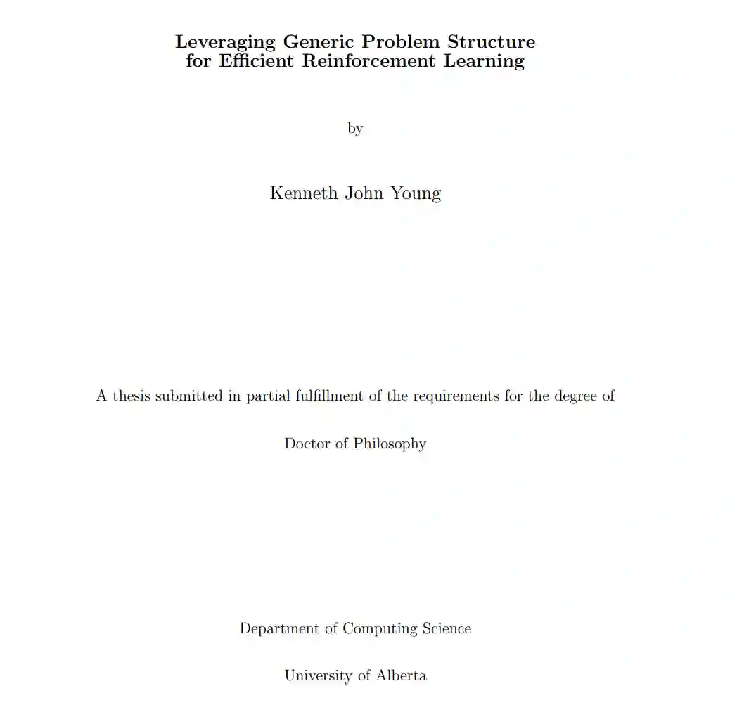 在本论文中,我研究了如何利用通用问题结构来提高强化学习算法的效率。通用问题结构是指存在于广泛问题中的基本结构(例如,当前采取的行动不会影响过去),而不是特定问题的特定结构(例如,关于某个游戏中哪些动作更优的启发式或定理)。我的研究分为三个主要贡献。