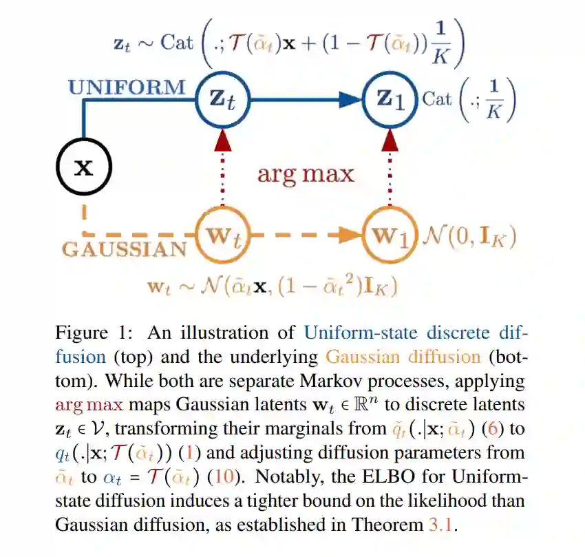 统一状态的离散扩散模型因其内在的自我纠错能力,被认为具有快速文本生成的潜力。然而,实际中它们的性能通常不如自回归模型(autoregressive models)和掩码扩散模型(masked diffusion models)。本研究旨在通过一个关键洞察来缩小这一性能差距:统一状态扩散过程本质上可由底层的高斯扩散自然导出。 我们提出了一种新方法 Duo,通过将高斯扩散中的先进技术迁移到离散扩散模型中,以提升训练与采样效果。 * 首先,我们引入了一种由高斯过程指导的课程学习策略(curriculum learning),通过降低方差,将训练速度提高了一倍。采用课程学习训练的模型在 7 个基准测试中的 3 个上,其零样本困惑度(zero-shot perplexity)超过了自回归模型。 * 其次,我们提出了离散一致性蒸馏(Discrete Consistency Distillation),该方法将“连续一致性蒸馏(consistency distillation)”扩展至离散领域。这一算法实现了扩散语言模型的少步采样(few-step generation),使采样速度提高了两个数量级。