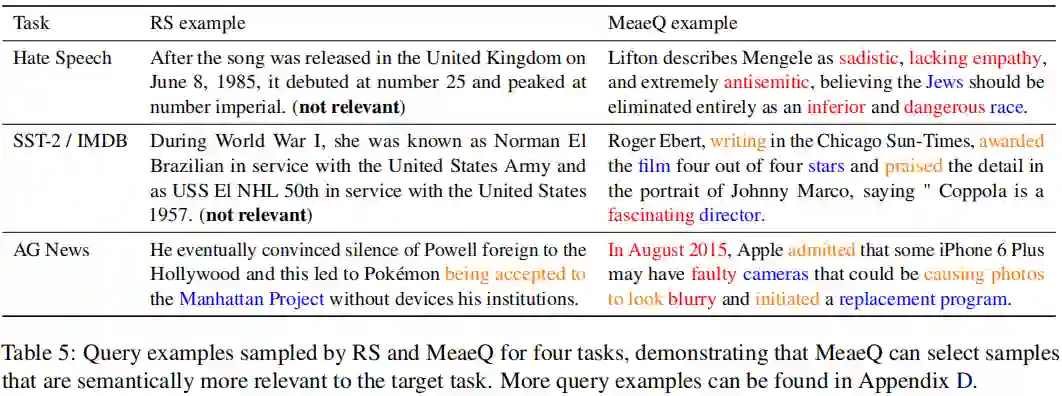 图6 前20个高频词结果 此外,我们在表5中给出了完整的样例,并高亮了与任务相关的词汇。我们可以看到MeaeQ样本的内容风格是与目标任务对齐的。对于Hate Speech,样本中倾向于包含消极或者仇恨情绪的词汇;对于SST-2 / IMDB,样本中包含一些积极或者消极的影评;对于AG News,样本中包含一些新闻的关键要素,例如时间、人物等。