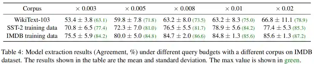 从表中我们可以看到,即使在自回归语言模型设置下,MeaeQ仍然优于基线方法。例如,gpt2-small达到了79.5%的功能一致性以及75.3%的测试准确率(达到受害者模型测试准确率的90.4%)。 四、分析 我们探索了不同任务相关程度的语料库对模型窃取的影响。我们模拟的受害者模型在IMDB数据集上训练。不同任务相关度的语料库包括WikiText-103(最原始的)、SST-2的训练集(与目标任务均属于电影情感分类领域)、IMDB的训练集(与目标任务同域)。实验结果如表4所示。我们观察到,语料库所在领域越是接近目标任务的领域,模型窃取的功能一致性越高。MeaeQ中的TRF正是源于这一观察。TRF旨在从公开无标注的语料库中过滤文本来拉近与目标任务数据的分布。