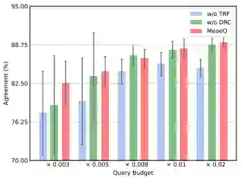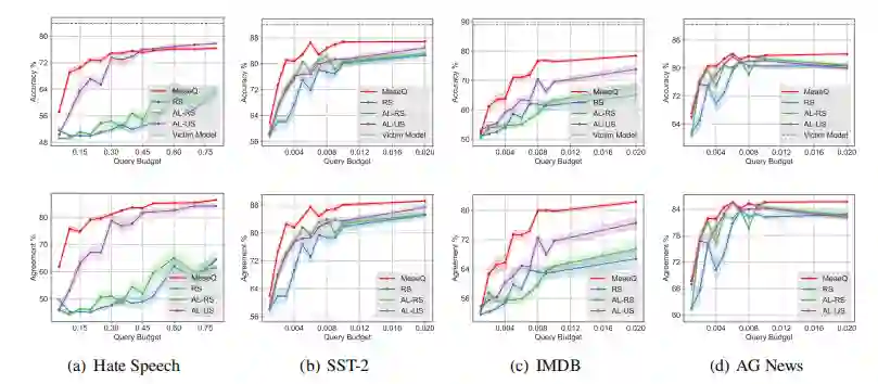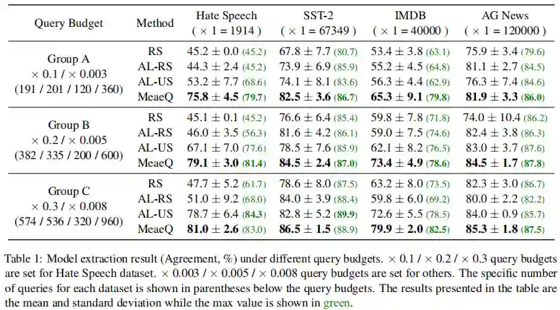 来查询API获取受害者模型的输出,并在此输入-输出对上训练他们自己的副本模型,由此完成模型提取攻击。 三、实验 我们使用公开的文本语料库WikiText-103作为攻击者的采样来源,使用bert-base作为受害者模型与攻击者模型的主干模型,并在四个基准数据集上进行了在不同Query预算情况下模型提取攻击的实验。实验结果如表1所示。从表中,我们可以看到,在低Query预算下,MeaeQ在所有数据集上都优于基线方法。MeaeQ窃取的模型表现出更高的功能:一致性以及性能稳定性。