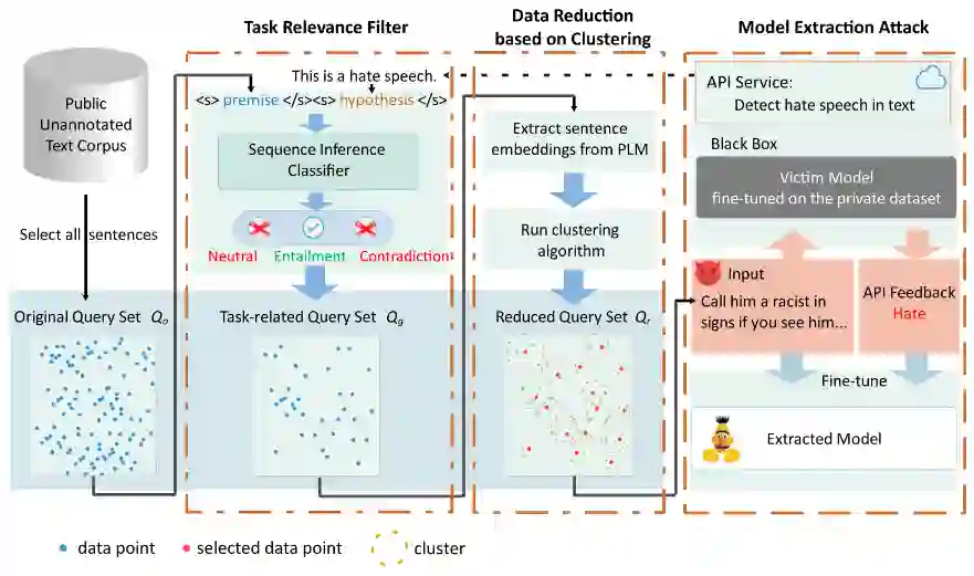 为了解决这些问题,我们提出了一种通过高效查询来执行模型窃取攻击的方法MeaeQ(Model extraction with efficient Queries),利用一个零样本序列推理分类器和一种基于聚类的归约技术来采样任务相关且多样的数据作为最终用于攻击的Query。