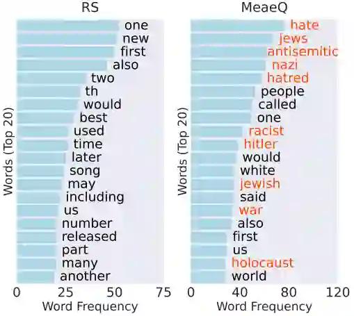 图5 DRC采样与RS采样数据分布可视化图 我们对MeaeQ和RS在Hate Speech任务上采样的样本分别进行了高频词统计,结果如图6所示。我们可以看到MeaeQ采样的样本包含许多与仇恨言论相关的词汇,例如“hate”、“antisemitic”、“nazi”等,这些词汇在RS采样的样本中几乎看不到。这说明了MeaeQ能够有效过滤得到任务相关的数据并且增加了数据多样性。