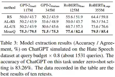 图4 消融实验 从图4中,我们可以看到MeaeQ在低Query预算下(例如×0.003 / ×0.005)显著优于两种变体(更高的Agreement),并且表现出更强的稳定性(更短的误差线)。本实验结果强调了TRF和DRC的重要性。 我们使用ChatGPT在零样本的设置下作为仇恨言论检测的分类模型,并额外使用了GPT-2作为攻击者模型架构,以探索MeaeQ在自回归语言模型窃取上的效果。实验结果如表3所示。