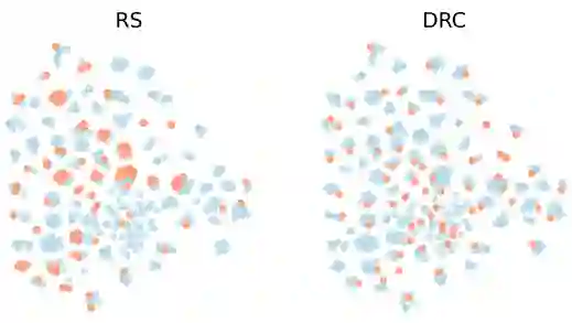 表4 不同语料库对模型提取结果的影响(Agreement,%) 我们使用t-SNE技术对数据归约进行了可视化,如图5所示。我们可以看到DRC采样的样本在整个数据域中广泛分布,而RS(Random Sampling)采样的样本出现了一部分重叠。这也说明了DRC采样是基于文本信息的,并且有效降低了冗余。