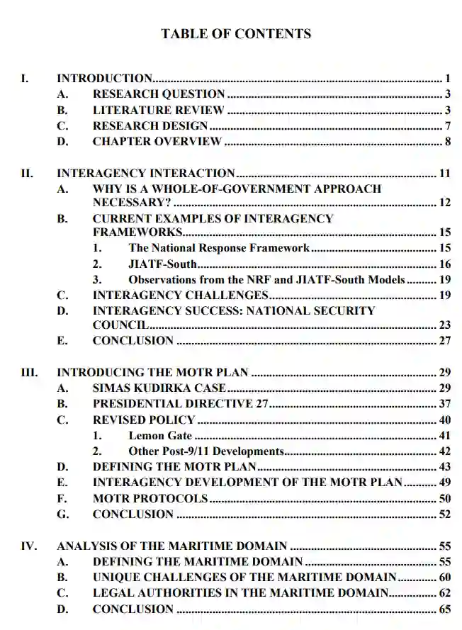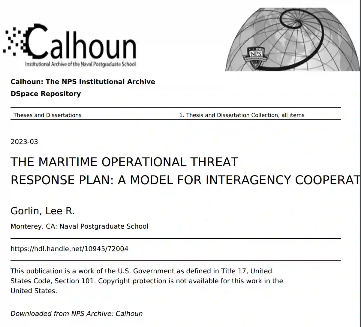 这篇论文提供了对海上行动威胁反应(MOTR)计划的全面理解,以及它如何成功地将联邦组织联系起来,以适应和处理海上领域独特环境中的威胁。这篇论文确定了MOTR计划的几个关键要素,为联邦、州或地方政府的其他领域以及对机构间合作感兴趣的国际伙伴提供了适应性。