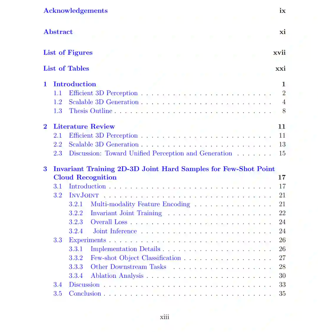 人类智能展现出非凡的灵活性和丰富性,尤其体现在其能够无缝地感知、交互并推理物理世界。我的研究旨在构建具备空间智能的人工智能系统——能够以类人感知和认知能力理解三维环境的机器。实现这一目标需要克服两个紧密关联的挑战:(1)高质量三维数据的稀缺,即使是最大的三维数据集,其规模也比不上网络级二维语料库的几个数量级;(2)三维表示本身的复杂性与非规则性,这体现在多样化的数据形式中,从点云到神经场,每种形式都需要专门的架构来处理。 为应对这些挑战,本论文提出了一种双重策略:一方面在数据稀缺条件下优化三维感知的效率,另一方面通过可扩展生成增强三维数据的体量与多样性。具体而言: * 高效三维感知:提出 InvJoint,通过引入不变性训练策略结合联合困难样本,缓解点云小样本感知中的数据稀缺问题。该方法提升了预训练二维与三维模型之间的协作,使稀疏三维数据的识别更具鲁棒性与效率。 * 可扩展且通用的三维生成:提出两种互补方法用于静态三维生成。DTC123 利用预训练的二维扩散模型引导单图像到三维的重建,并通过时间步课程学习实现由粗到细的对齐与多视角一致性。MVGamba 则突破了逐场景优化的局限,将状态空间建模与三维高斯泼溅(3D Gaussian Splatting)相结合,在单一框架下实现统一而高效的文本生成三维和稀疏视角重建。 * 动态世界建模:提出 NutWorld,将静态三维生成扩展至动态环境,可将随意捕获的视频转化为动态三维场景。通过其结构化的**时空对齐高斯(STAG)**表示和基于 Transformer 的自编码器,NutWorld 支持实时视频驱动的四维场景建模,并增强了对物理环境的推理能力。