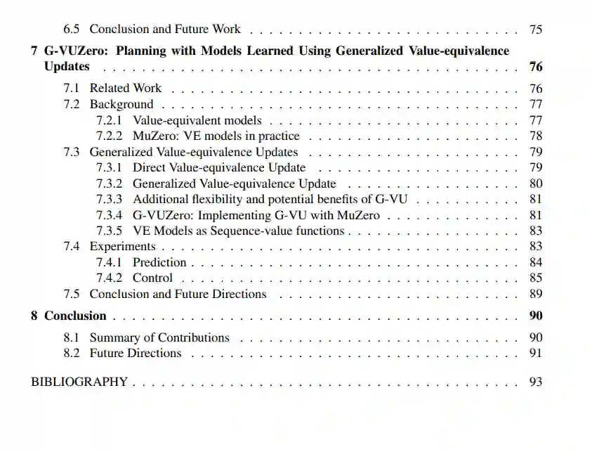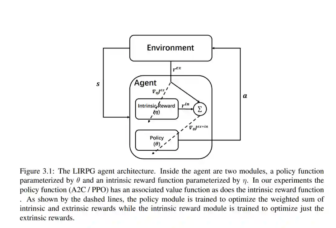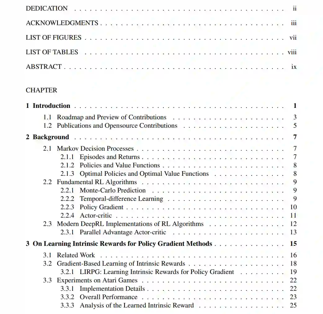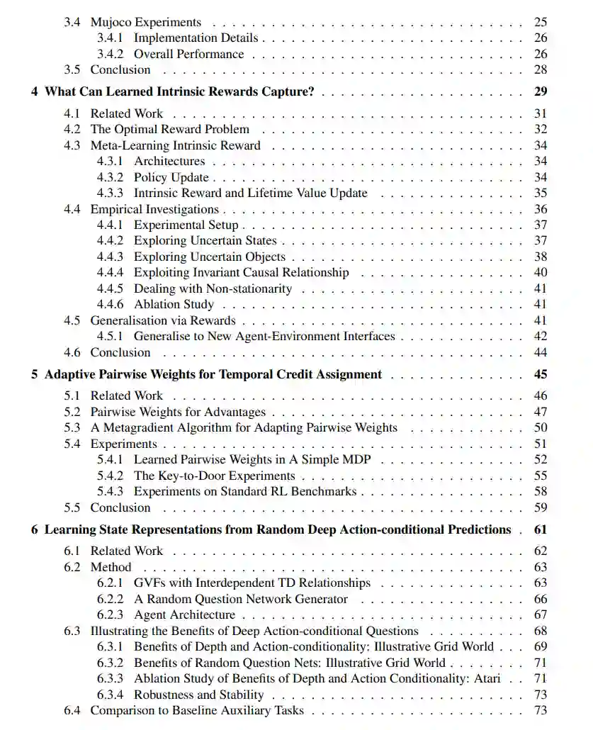 **本文旨在进一步推进深度学习技术。具体而言,本文在以下四个方面做出了贡献:1)在奖励设计方面,提出了一种新的元学习算法,用于学习有助于策略优化的奖励函数。**该算法提高了策略梯度方法的性能,并优于手工设计的启发式奖励函数。在后续研究中,学习到的奖励函数可以捕获关于长期探索和开发的知识,并可以泛化到不同的强化学习算法和环境动态的变化。2)在时间信用分配中,本文探索了基于成对权重的方法,这些权重是采取行动的状态、收到奖励的状态和之间经过的时间的函数。本文开发了一种元梯度算法,用于在策略学习期间自适应这些权重。实验表明,该方法比其他方法取得了更好的性能。3)在状态表示学习中,本文研究使用随机深度动作条件预测任务作为辅助任务,以帮助智能体学习更好的状态表示。实验表明,随机的深度动作条件预测通常可以产生比手工设计的辅助任务更好的性能。4)在模型学习和规划中,提出了一种学习价值等价模型的新方法,这是一类最近表现出强大经验性能的模型,推广了现有的方法。实验结果表明,该方法能够提高模型预测精度和下游规划过程的控制性能。