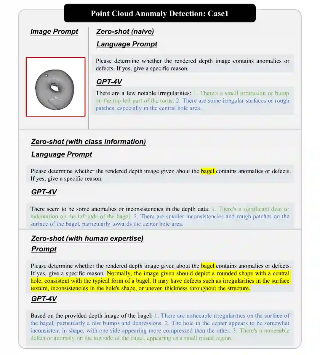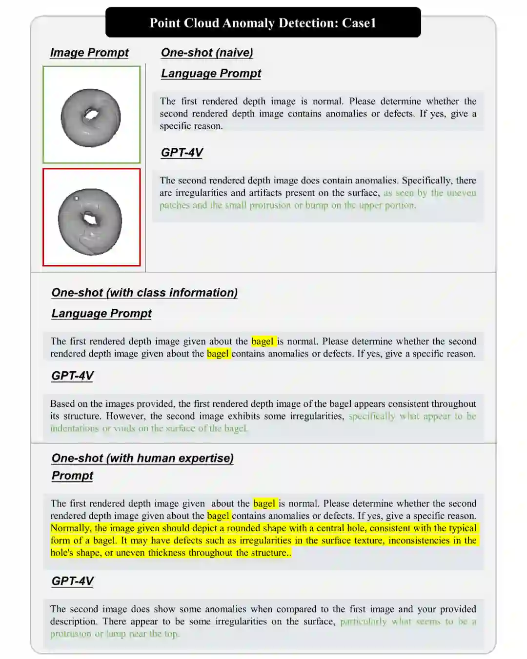 点云异常检测在工业领域具有重要作用。CPMF 提出了一种新方法,将点云转化为深度图像,以利用图像基础模型来提高点云异常检测的性能。我们借助 CPMF,将点云转为深度图像,从而使得 GPT-4V 可处理点云异常检测任务。 我们展示了 GPT-4V 在点云异常检测中的性能,包括识别袋圈中的小突起、检测绳子上的异常以及查找工件中的异常。GPT-4V 能够有效地识别这些异常,但在某些情况下也存在局限性,特别是在渲染质量较低的情况下。总的来说,GPT-4V 在点云异常检测中表现出了潜力。