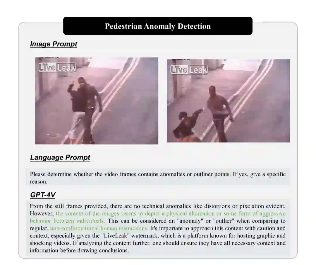 多模态异常检测:GPT-4V 可有效处理多种模态数据的异常检测任务。例如,它在识别图像、点云、MRI、X-ray 等数据模态上均表现出了不俗的异常检测能力。多模态异常检测能力使 GPT-4V 能够突破传统单模态异常检测器的限制,完成现实世界的复杂异常检测任务。 多领域异常检测:GPT-4V 在工业、医疗、行人、交通和时间序列异常检测等多个领域表现优异。 零 / 单样本下的异常检测:GPT-4V 在零样本及单样本(即提供了一张正常的参考图片)任务中均表现不俗。在没有参考图像的情况下,GPT-4V 可以有效地使用语言提示信息来检测异常。当提供正常参考图像时,GPT-4V 能够更好的对齐文本格式的正常标准与正常的图像内容,其异常检测准确性进一步提高。 GPT-4V 可以理解异常检测任务所需的全局和细粒度语义