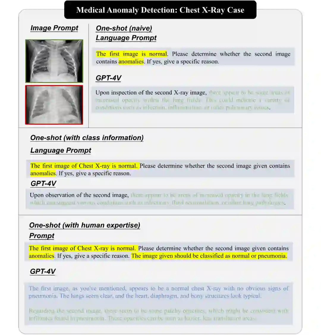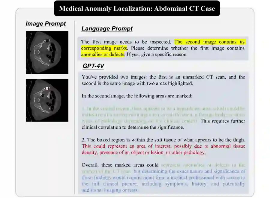 医学图像异常检测是医学影像领域的关键任务,旨在识别不符合预期数据分布的异常值。我们研究了 GPT-4V 在医学图像异常检测中的应用,包括不同疾病和成像模式的医学图像。我们测试了 GPT-4V 的泛化能力,揭示了其在医学图像异常检测中的性能和局限性。 我们展示了 GPT-4V 在医学图像异常检测中的性能,包括识别不同疾病和成像模式的异常图像。即使只提供简单的语言提示,GPT-4V 能够有效地识别异常,并提供详细的解释。此外,引入更多信息,如疾病信息和专业知识,可以进一步提高 GPT-4V 的性能。然而,GPT-4V 在某些情况下可能会产生错误的异常检测,因此仍需要医生的最终判断。