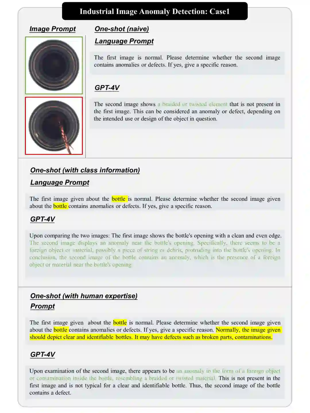 工业图像异常检测旨在维护产品质量,是制造过程的重要环节。近年来,许多方法在此领域蓬勃发展,**其中一些方法着眼于开发适用于任意产品类别的统一模型。**本研究探讨了 GPT-4V 在工业图像异常检测中的应用,包括对不同类型的信息进行测试,以及展示其性能和局限性。 我们从工业图像中选择了几个示例,如瓶子和蜡烛的图像。即使只提供简单的语言提示,GPT-4V 能够有效地识别这些图像中的异常,展示了其能力和多样性。此外,GPT-4V 不仅能够检测期望的异常,还能够识别微观结构异常。在复杂情况下,如电路板中的异常检测,GPT-4V 能够识别图像中的细节,但也存在一定的局限性。总的来说,GPT-4V 在图像上下文理解和类别特定异常理解方面表现出色。