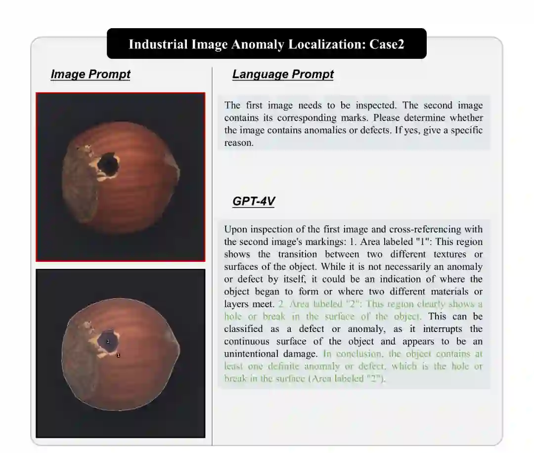 与工业图像异常检测不同,工业图像异常定位旨在精确识别异常的位置。为了实现这一目标,我们采用了与 SoM(Set-of-mark)类似的方法,使用图像 - 掩模对来提示 GPT-4V。我们研究了 GPT-4V 在不同场景下的表现,展示了其在细粒度异常定位方面的能力和局限性。 我们展示了 GPT-4V 在工业图像异常定位中的性能,包括定位弯曲的电线、坚果上的空洞以及识别电路板异常。GPT-4V 在一些情况下能够准确识别异常位置,例如能够有效定位坚果中的空洞,并且由于结合了视觉提示技术,GPT-4V 将异常定位问题转化为了对掩膜的分类问题,有效降低了问题复杂度,且提升了定位精度。因此,结合视觉提示技术和 GPT-4V 可有效解决工业图像异常定位问题。