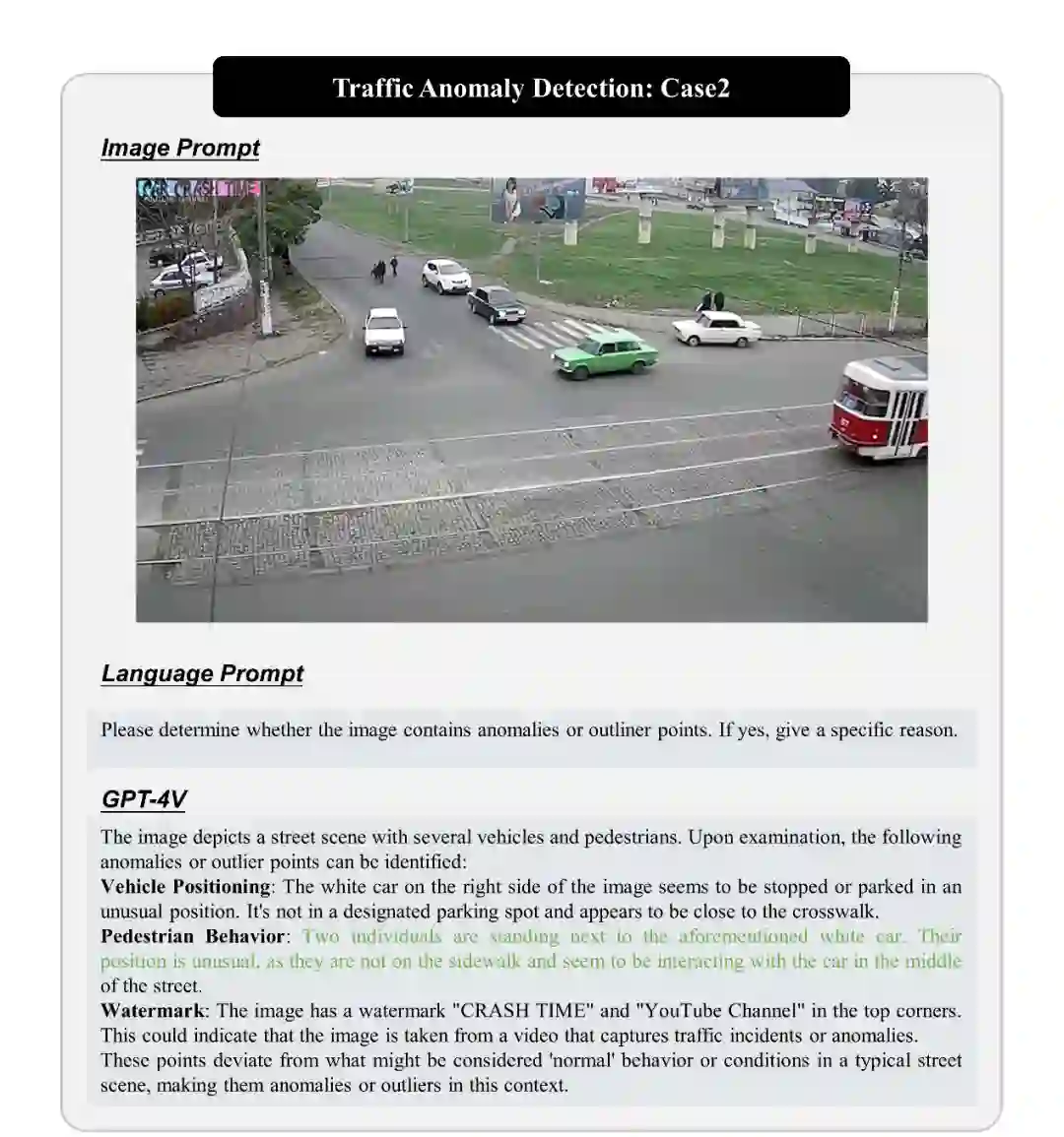 **交通检测是城市交通管理和自动驾驶领域的关键任务,它旨在监测交通情况,检测交通违规行为和危险情况。我们研究了 GPT-4V 在交通检测中的应用,包括车辆识别、交通标志识别和交通违规检测。我们测试了 GPT-4V 在不同场景下的性能,展示了其潜力和局限性。 我们展示了 GPT-4V 在交通检测中的性能,包括识别不同类型的车辆、检测各种交通标志和识别交通违规行为。GPT-4V 能够有效地处理这些任务,尤其是在规范场景下。然而,在复杂交通环境中,性能可能会下降,因为它需要理解并解释复杂的情境。