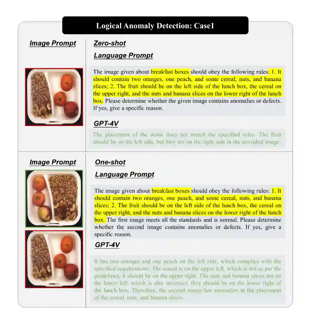 逻辑异常检测任务由 MVTec LOCO 数据集提出。该任务通常出现在装配过程中,需要识别各个组件是否正确组合。现有的逻辑异常检测方法通常依赖于视觉全局 - 局部对应关系,但本质上并没有真正理解图像内容。我们研究了 GPT-4V 在逻辑异常检测中的应用,探讨了其对图像内容的理解能力。 我们展示了 GPT-4V 在逻辑异常检测中的性能,包括识别复杂的逻辑规则、检测逻辑异常并提供详细的解释。尽管 GPT-4V 在大多数情况下能够准确识别逻辑异常,但在某些复杂情况下存在一定的局限性,尤其是对于细节问题。不过,结合多轮对话和特定语言提示有望显著改善 GPT-4V 在这些情况下的性能。