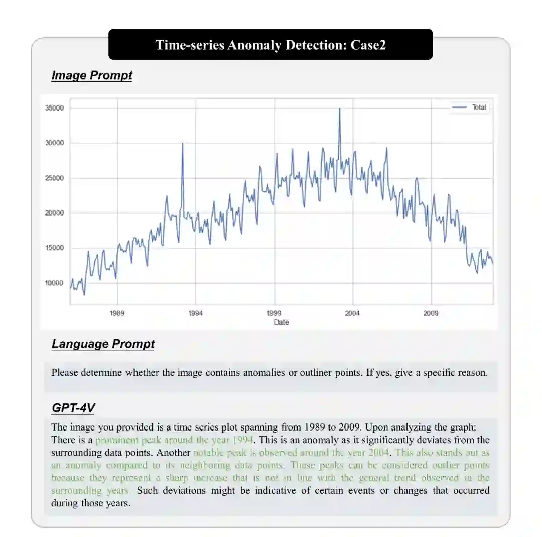 时序检测是一种涉及到时间序列数据的异常检测任务,例如传感器数据、金融时间序列等。我们研究了 GPT-4V 在时序检测中的应用,测试了其在分析和检测时间序列异常方面的能力。 我们展示了 GPT-4V 在时序检测中的性能,包括检测传感器数据中的异常、金融交易数据中的异常等。GPT-4V 在分析时间序列数据方面表现出色,能够识别不同类型的异常情况。然而,需要注意的是,时序检测通常需要更多的领域专业知识,而 GPT-4V 在这些情况下可能需要结合专家的建议。