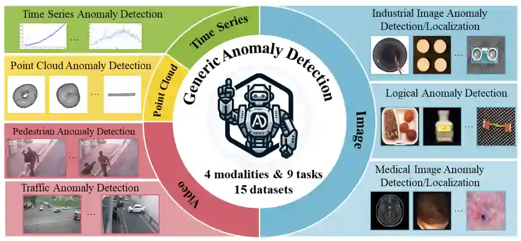 最后,我们需要评估提供的数据是否符合已建立的正常数据分布。任何偏离这些数据分布的情况都可以被归类为异常。 最近,大型多模态模型(LMM)迅猛发展,其中 OpenAI 最近推出的 GPT-4V (ision) 表现最为出色,具有强大的多模态感知能力,在场景理解,图片生成等多个任务中都取得了良好表现。我们认为,LMM 的出现为通用异常检测的研究提供了新的范式和新的机会。 为了评估 GPT-4V 在通用异常检测中的性能,来自华中科技大学、密歇根大学和多伦多大学的研究者联合进行了一项研究,在涉及 4 个数据模态,9 个异常检测任务的 15 个异常检测数据集上对 GPT-4V 进行了全面的测试。具体而言,测试的数据集包括图像、点云、视频、时序等模态,并涵盖了工业图像异常检测 / 定位,医疗图像异常检测 / 定位,点云异常检测,逻辑异常检测,行人异常检测,交通异常检测,时序异常检测等 9 个异常检测任务。