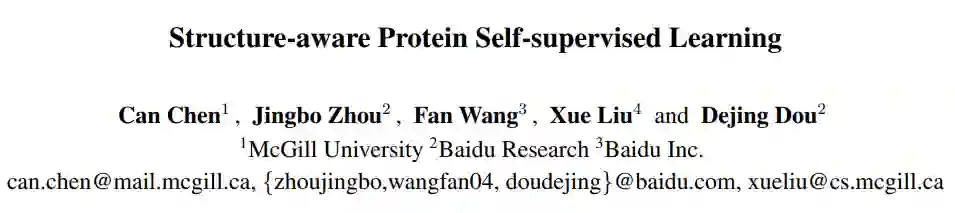 今天给大家介绍的是来自百度的商业智能实验室团队和 麦吉尔大学 Can(Sam) Chen发表在arxiv的预印文章《Structure-aware Protein Self-supervised Learning》。这篇文章设计了针对蛋白质结构的预训练任务,并运用双层优化和互信息捕捉序列信息和结构信息的一致性,在下游任务上取得了当前最好的结果。