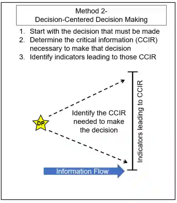 然而,在某种程度上,所有的CCIR最终都是为了支持指挥官的决策。当前理论中的一个潜在缺陷是,通过在MDMP的任务分析步骤中指导PIR的形成,参谋人员开始在一个数据丰富的环境中编制CCIR,而这一环境从一开始就脱离了潜在决策的背景。为了将CCIR与决策点(DPs)联系起来,有两种广泛的方法。