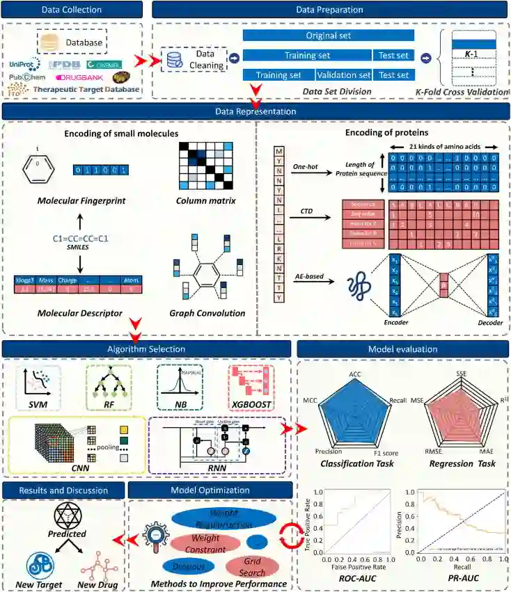 该文还简述了AI在药靶和药物发现中的具体应用流程(如下图所示)。首先从公共数据平台或者实验获得的数据中收集所研究问题所需的全部数据。然后将数据集划分为训练集、验证集和测试集。接下来,不同格式和类型的数据被编码为向量或矩阵的形式,用于模型训练。根据要研究的问题,选择或建立合适的模型来执行预测任务。采用不同的评估方法从多个维度对建立的模型进行性能评估,以此来调整模型以及模型参数等,直到模型达到令人满意的性能。最后对于模型预测出来的结果进行讨论和分析。