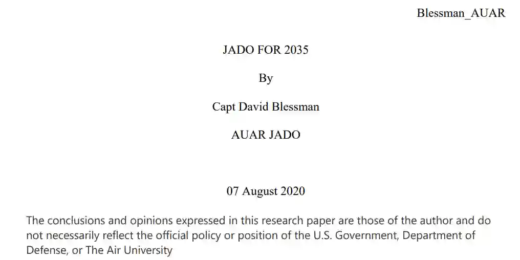 JADO领导人需要训练。为了让下一代作战指挥官有效地利用所有领域,美国防部需要近期有能力在整个JADO环境中进行训练、演习和兵棋推演。创建多个JADO侵略者单位将允许作战单位为未来的冲突做准备,并能在军事战役中发挥效力。