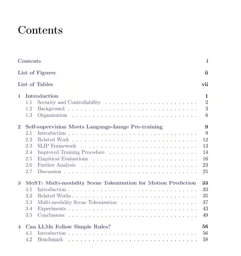 未经授权的方可能会试图修改系统的原始目标,方法包括覆盖明确的指令或在上下文窗口中插入恶意内容,从而将模型的行为引导向不同的目标。在LLM之前,对抗性机器学习研究主要集中在计算机视觉模型或自动驾驶应用上。研究人员提出了许多不同的攻击方法,其中许多假设了不切实际的威胁模型,比如攻击者拥有模型架构和权重的全部知识,但现实中有效的攻击也广泛存在于文献中。研究界的共识是,这方面的工作迄今未能提供有意义的解决方案。 今天,模型提供商通常会将行为限制训练到模型中,以防生成违反使用政策的内容。然而,这些防护栏往往容易通过“AI越狱”被绕过。虽然新发布的模型现在对常见的越狱攻击具有更强的抗性,但红队竞赛表明,任何模型都无法完全抵抗决心强烈的攻击者。随着我们继续为AI系统引入额外的能力,如多语言和视觉识别,可能的攻击数量呈组合式增长。 本论文的第一章《自监督与语言-图像预训练的结合(SLIP)》源于我在与Meta的FAIR研究小组合作期间进行的一系列复制实验。我们沿袭了OpenAI的CLIP项目的做法,这是一个真正具有突破性的项目,发布于2021年,它将计算机视觉领域引入了网页规模的数据策划和预训练,成为了当前所有视觉和语言模型的第一个共同祖先,包括像DALL-E和Stable Diffusion这样的文本到图像模型,以及像GPT-4和Gemini这样的多模态LLM。在对一部分公开数据进行的小规模实验中,我们发现,将自监督学习与图像和标题对比学习相结合,能够在不同的评估环境和视觉识别任务中,显著提高图像表示质量。后来的视觉和语言预训练方法增加了越来越多的训练目标,这一趋势我们虽然无法声称是我们开创的,但无疑是我们在早期阶段就识别出来的。 在展示这项工作时,我结识了Waymo的应用研究团队,并在一次夏季研究实习中继续沿着这个方向深入,探索如何将SLIP等预训练的视觉表示应用于自动驾驶汽车。第二章《MoST:用于运动预测的多模态场景标记化》呈现了这项研究的成果,我们在其中解决了预测附近道路使用者(如其他汽车、骑行者、行人等)的运动轨迹的问题,这是Waymo在其汽车中部署的模块化自动驾驶架构的关键组成部分。通过将丰富的高维图像和点云特征与之前运动预测模型所依赖的符号化对象和场景表示结合,我们能够提高模型预测的准确性和稳健性。如今,Waymo的汽车在路上使用的更先进版本的这种方法,将许多传感器和感知信号引入了上下文中。 此时,预训练的规模已远远超过了即使是装备精良的学术研究小组在行业中的资源,我决定在LLM领域探索新的方向。在最初的GPT-4 API发布中,隐藏着一个很少使用的请求参数,叫做“系统消息”,用于向模型传达更高优先级的指令。我意识到,如果应用开发人员要实际使用这个功能来定制LLM以适应他们的特定用例,那么模型必须可靠地遵守系统消息中指定的任何规则,即使这些规则与用户指令相冲突。第三章《LLM能遵循简单规则吗?》中,我开发了一个评估方法,用于衡量LLM在像玩石头剪子布这样的简单交互场景中,遵循可验证规则的能力。我们的研究表明,各种简单而巧妙的用户消息都能说服即使是最强大的模型违反原始规则。当时,只有一小部分LLM支持系统消息或指令,但即便如此,这些模型也无法始终如一地遵循我们的规则。一年后,几乎所有模型都声称支持系统消息或指令,并且系统提示已成为“编程”LLM应用程序的普遍认可方法。然而,研究界仍然缺乏对系统提示在满足开发人员和用户期望的所有角色中的可靠性进行全面评估的方法。在《系统提示鲁棒性深入分析》中,我们整理了一个评估套件,衡量系统提示在不同设置中的可靠性。例如,我们设计了一个评估,包含多轮对话,模型需要处理不同数量的需求,如装饰名字或为场景描述添加特定的修饰语。我们还建立了对不同系统提示、冲突的用户消息、对抗性攻击、干扰性无关输入以及代理工具调用应用程序的系统提示鲁棒性评估。我们的结果表明,尽管最大的最新模型能够更加可靠地遵循系统提示,但它们仍然未能达到传统编程语言所能提供的可靠性水平。最后,我们还从一组第三方系统提示中收集了演示和偏好数据集,这些提示来自于各种在线来源。我们对这些数据集进行微调,能够显著提高模型对系统提示的遵守能力,证明了更系统化的数据收集能够显著提高模型表现,甚至超过了用于开发像Qwen和LLama这样的模型的复杂后期训练方法。