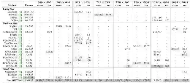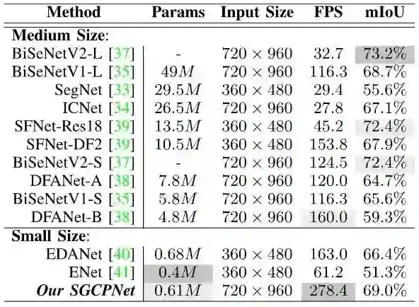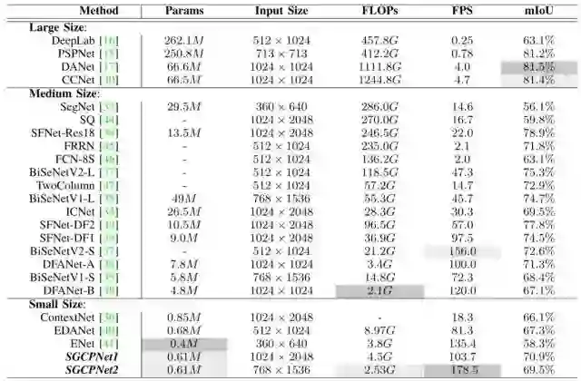 中型模型的存储和计算开销远小于大型模型,它们在效率方面往往能取得较为良好的表现,如SFNet-DF1[39]和DFANet [38]可以实现大约100 FPS的分割速度,并且模型参数也小于10 M。小尺寸模型的存储和计算成本成通常很小,因此它们比较适用于资源受限的场景。表2表明SGCPNet在所对比的模型中具有第二小的模型尺寸(Params = 0.61 M),且它的模型参数比中型和大型模型小几十、甚至几百倍。此外,该模型在几乎所有的分辨率上都具有最小的FLOPs和更快的分割速度。