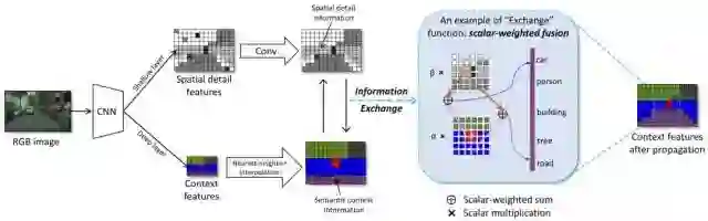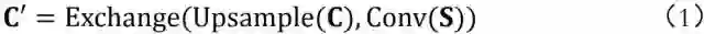 其中C'表示传播后的上下文特征。在公式(1)中,卷积操作Conv(·)被用来进一步细化S的空间细节信息,因为网络浅层特征通常会包含一定的噪声。为了提升模型效率,本文采用了可分离卷积[42]去实现卷积操作。交换函数Exchange(·,·)可以被设计成不同的形式,例如特征的直接融合、或构建像素级的注意力机制。为促进模型在有效性和效率之间取得良好平衡,在此将交换函数Exchange(·,·)设计为简单的线性加权融合: