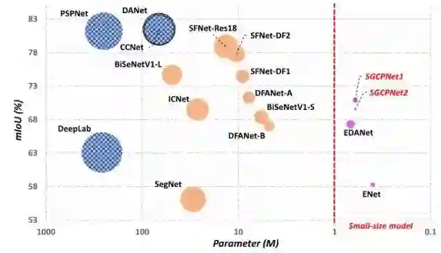 对于实时语义分割任务,准确性和效率之间的平衡是模型评估的重要指标。这一节将SGCPNet和相关模型在准确性和效率之间的平衡方面进行了对比。
