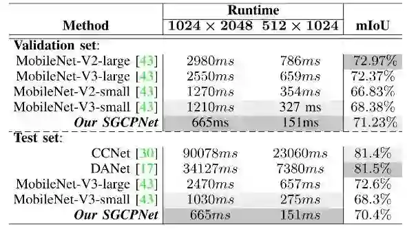 表2将SGCPNet和相关模型在不同分辨率下进行了对比。为了比较的公平性,表中在所有的分辨率上均测试了SGCPNet的效率。从表2可以看出,大尺寸模型专注于提高分割精度,它们往往需要消耗昂贵的计算开销。例如,DeepLab [16]共包含262.1 M参数,分割一张512 × 1024图片,其需消耗457.8 GFLOPs,且分割速度仅为0.25 FPS;PSPNet[15]包含250.8M参数,处理一张713 × 713 图片需消耗421.2 GFLOPs,并且运行速度仅为0.78 FPS。尽管CCNet [30]和DANet [17]具有较少的参数,但它们的FLOPs仍保持在较高水平,并且它们的速度远远不能满足实时处理的需求。