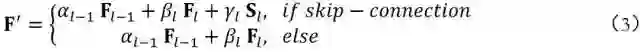 其中F_{l-1}和F_{l}分别表示来自第(l-1)层和第l层的特征图。特别地,F_{l-1}包含更多的空间细节信息,而 F_{l}包含更多的上下文信息。如公式(3)所示,当存在跳跃连接时,进一步考虑来自第l层的特征S_{l}。标量\alpha_{l-1}、\beta_{l}和\gamma_{l}是可学习的权重,用于控制F_{l-1}、F_{l}和S_{l}之间的平衡。根据公式(3),基于空间细节引导的上下文传播策略可以被重新解释如下:通过利用F_{l-1}中所包含的空间细节的引导,将F_{l}中的上下文传播到邻域,在上下文信息的传播过程中F'中的空间细节信息被逐步重构。