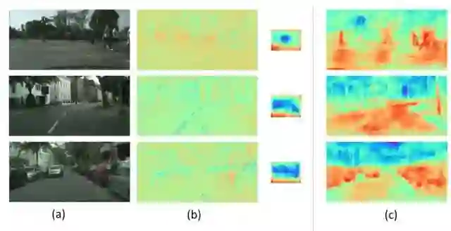 图6. SGCP模块处理后的上下文特征可视化。对于(b)和(c),红色表示较高的响应,而蓝色表示较低的特征响应。上图中,(a)表示输入图像,(b)表示原始的空间细节特征和全局上下文特征。(c)表示SGCP模块处理后的上下文图。