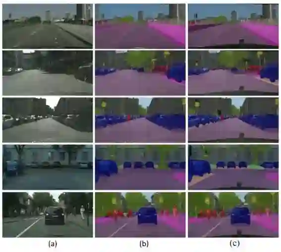 图7. 本方法在Cityscapes验证集上的一些典型的分割结果示例。其中,(a)表示输入RGB图片,(b)表示本方法所得到的分割结果,(c)表示分割的真值标签。