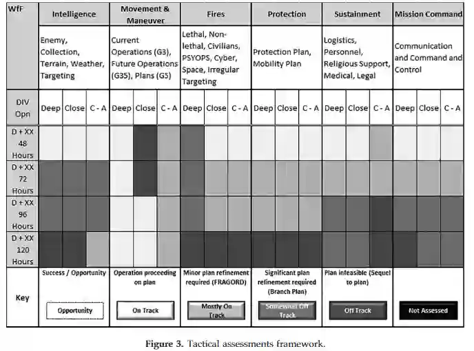 为应对这些条令知识缺口和问题,提供了一套支持战术评估的方法,特别适用于师级作战行动。提供了一个精炼的作战评估框架,并描述了一种在战术司令部内实现作战评估和基于风险信息决策制定的综合方法。方法包含了最初由作者在实战行动和训练演习中开发并验证的最佳实践,并提供了对美国陆军计划与评估条令的更新建议。在接下来的部分,将对现行评估条令和文献进行概述。随后,将介绍并描述战术评估方法,接着讨论其在两次师级训练演习中的应用。最后,将对该方法、其局限性以及对评估界的建议进行探讨。