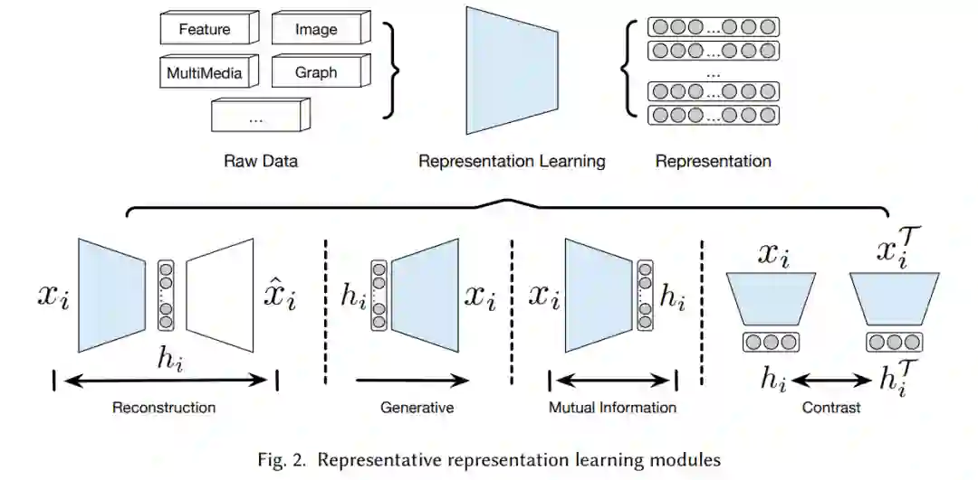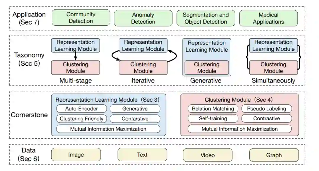 虽然浅聚类方法已经取得了巨大的成功,但它们假设实例已经在一个具有良好形状的潜在矢量空间中表示。随着过去几十年互联网和web服务的快速发展,研究人员对发现新的机器学习模型越来越感兴趣,这些模型能够处理没有明确特征的非结构化数据,如图像,以及具有数千维的高维数据等。因此,浅聚类方法不能再直接用于处理此类数据。近年来,深度学习的表示学习取得了成功,特别是在非结构化和高维数据中[166,201]。然而,在聚类过程中并没有探索深度学习技术。由于不能很好地捕捉到实例间复杂的关系,导致聚类结果欠佳。