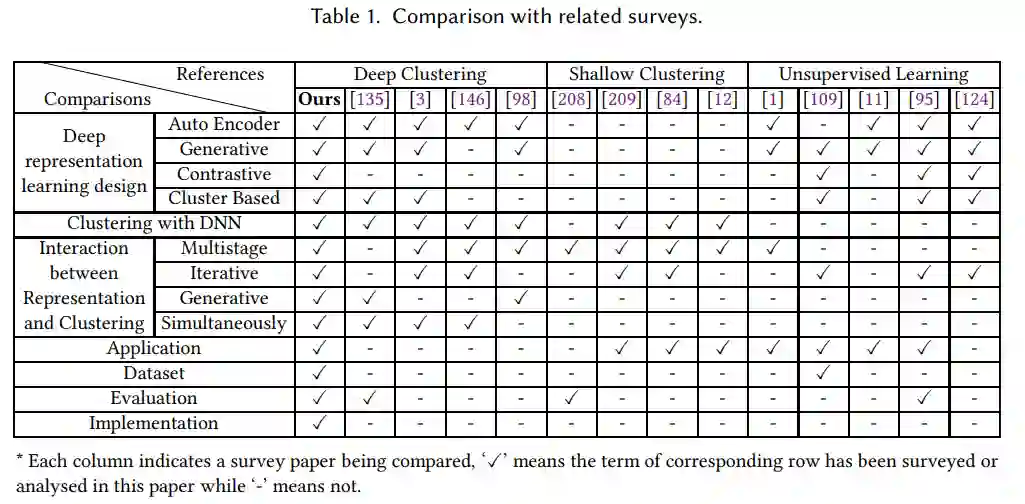 在这个调研中,我们关注深度学习技术的聚类,特别是深度表示学习和深度神经网络聚类之间的相互作用。对于其他基础研究问题,如初始化聚类、自动识别聚类数量等,我们在第8节中进行了讨论,并将其留待以后的工作。关于浅聚类、深聚类和表示学习的调研比较见表1。