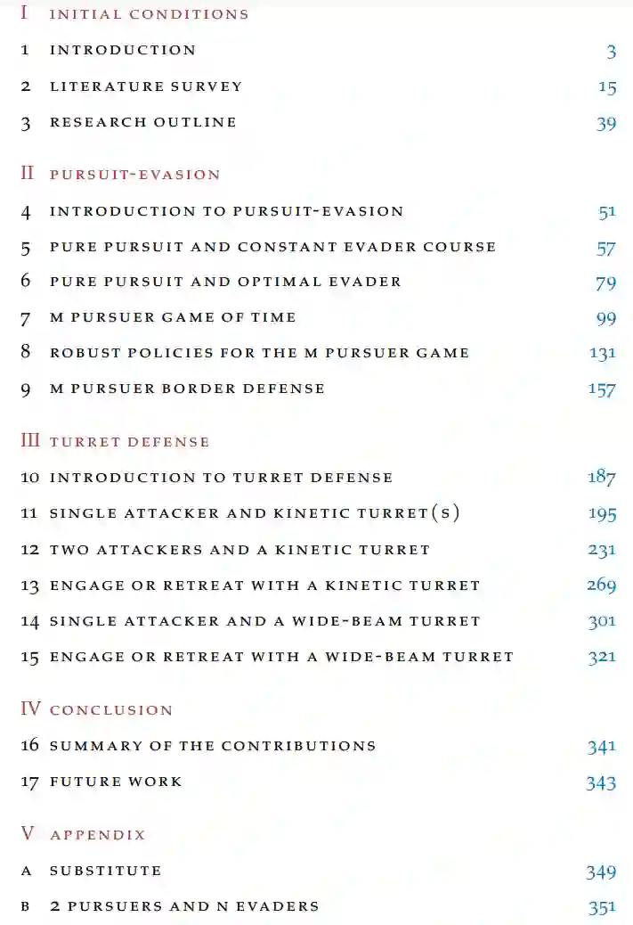 在下一节中,将使用 DGT 提出并求解一个经典的追逐-规避场景,其中涉及一个追逐者和一个规避者,以介绍一些关键概念,如参与者、成本函数、控制变量、均衡和价值。第 2 章包含文献调查,为拟议的研究提供必要的背景并确定关键主题。第 3 章将拟议计划具体化为一系列研究目标;最后讨论了所采用方法的挑战和优势。