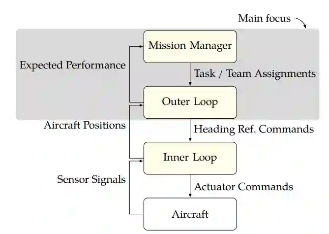 关注的两个主要问题领域是追击-规避和目标防护。在前者中,一个追击者(或一组追击者)试图捕获一个规避者(或一组规避者)。在后者中,防御者试图阻止攻击者到达一组目标状态,这组目标状态可能代表感兴趣的区域或移动智能体的位置。请注意,在本文档的其余部分中,将遵守智能体名称大写的惯例。对于这两个问题领域,主要关注的是智能体的空间机动性。图 1.1 显示了智能体(如飞机)内部各层自主(或自动)控制之间的概念关系。如图所示,本文提出的研究主要涉及最上两层:任务管理器和外循环。例如,本文提出的分析和算法可能会根据 "高层 "决策(如飞机应完成的任务)或以 "高层 "决策为前提,为飞机规定航向参考指令。假定存在一个 "低级"(内环)控制器,该控制器向飞机发送执行器指令,以跟踪外环提供的参考指令。反过来,内环向外环提供飞行器状态信息(如位置)。外循环提供分配任务的性能估计值,任务管理器利用该估计值来评估是否进行更新,例如重新分配任务或重新组建团队。在追击-规避和目标防护方面,任务管理器的可能功能包括为飞行器分配角色或分配任务,例如为追击者分配特定的 "规避者 "作为目标。其他可能的角色包括:充当诱饵,以吸引队友的注意力;充当前锋,瞄准目标;或充当阻挡者,以防止切断对手的某些路径等。此外,任务管理器还可能负责做出不连续的决定,例如攻击者是否应该与防守者交战或完全撤退。