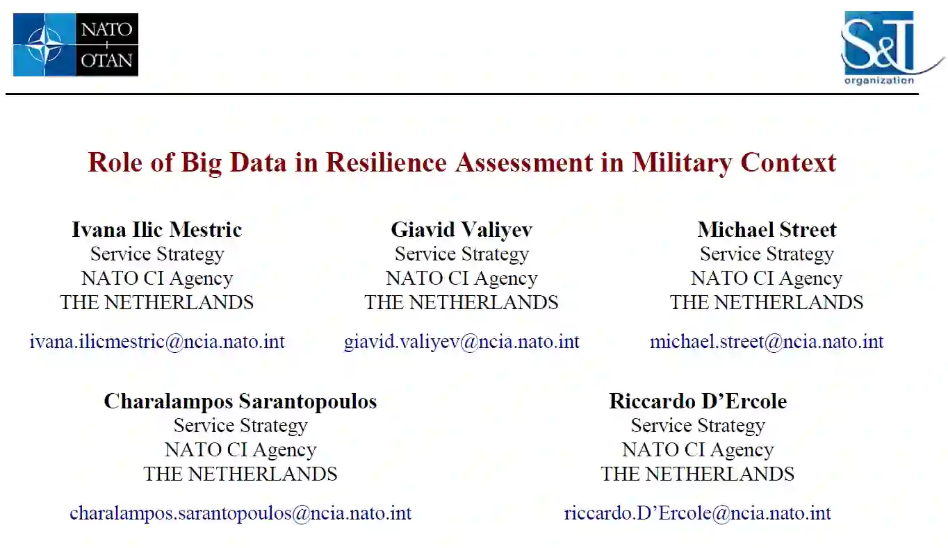 在去年,北约CI机构数据科学团队参与了一项创新性的概念验证,包括转型和作战命令,如ACT、SHAPE和JFCBS;为了识别、提取、计算和呈现开源数据中最相关的指标,以支持整个联盟的弹性评估。由于弹性评估是一项复杂的评估,它依赖于许多不同领域和事件的关系,因此该项目定义了较小的范围,重点关注以下关键领域: