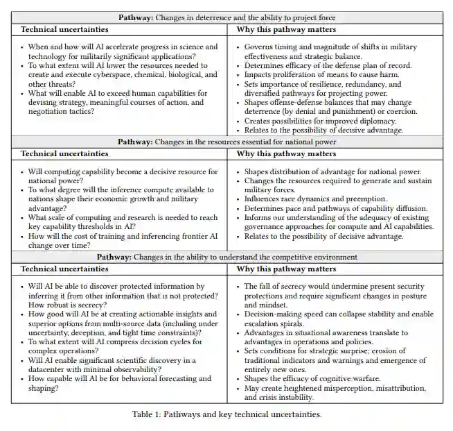 人工智能将重塑国际安全与各国间的力量平衡。最重大的变化与人工智能增强或威胁治国方略主要功能的方式相关联。我们从三个维度审视这些影响:威慑与力量投送;支撑国力的资源;以及国家理解与适应动态战略环境的能力。本分析借鉴了对国家安全高级领导人的访谈,这些访谈提供了关于人工智能影响的见解以及对该技术的看法。这些讨论的一个核心主题是深刻的技术不确定性。人工智能的未来特性仍然足够不明朗,以至于允许对安全图景存在截然不同且常常相互矛盾的构想。我们识别了其中最重要的不确定性。人工智能界为缩小这些关键理解差距所做的工作,将增强国家领导人制定政策以维护全球稳定的能力。这些工作也将帮助科技公司更好地理解人工智能的更广泛影响,提高其为设计和部署日益强大的系统做出负责任决策的能力。