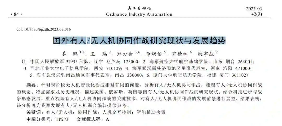 针对现阶段无人机智能化程度相对有限的问题,分析有人/无人机协同作战。梳理有人/无人机协同作战 的概念、特点需求及历史概况;描述美国、俄罗斯、英国等国有人/无人机协同作战的研究现状;结合科技进步与战 争形态发展,重点梳理有人/无人机协同作战的关键技术,对有人/无人机协同作战的发展前景进行展望。结果表明, 该分析可为我军发展有人/无人机混合编队提供参考。