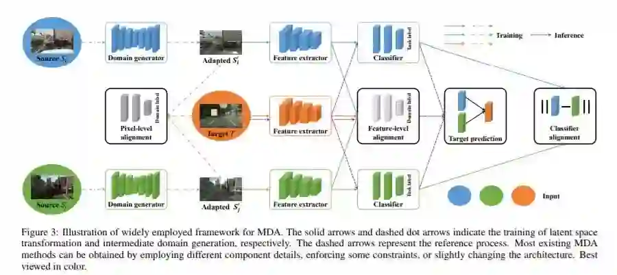 在许多实际应用中,获取足够的大规模标记数据以充分训练深度神经网络通常是困难和昂贵的。因此,将学习到的知识从一个单独的、标记过的源域转移到一个未标记或标记稀疏的目标域成为一种有吸引力的选择。然而,直接转移常常由于域转移而导致显著的性能下降。域适应(DA)通过最小化源域和目标域之间域转移的影响来解决这个问题。多源域自适应(Multi-source domain adaptation, MDA)是一种功能强大的扩展,可以从具有不同分布的多个源收集标记数据。由于DA方法的成功和多源数据的流行,MDA在学术界和工业界都受到越来越多的关注。在本次综述中,我们定义了各种MDA策略,并总结了可供评估的可用数据集。我们还比较了深度学习时代的MDA方法,包括潜在空间转换和中间域生成。最后,讨论了未来MDA的研究方向。